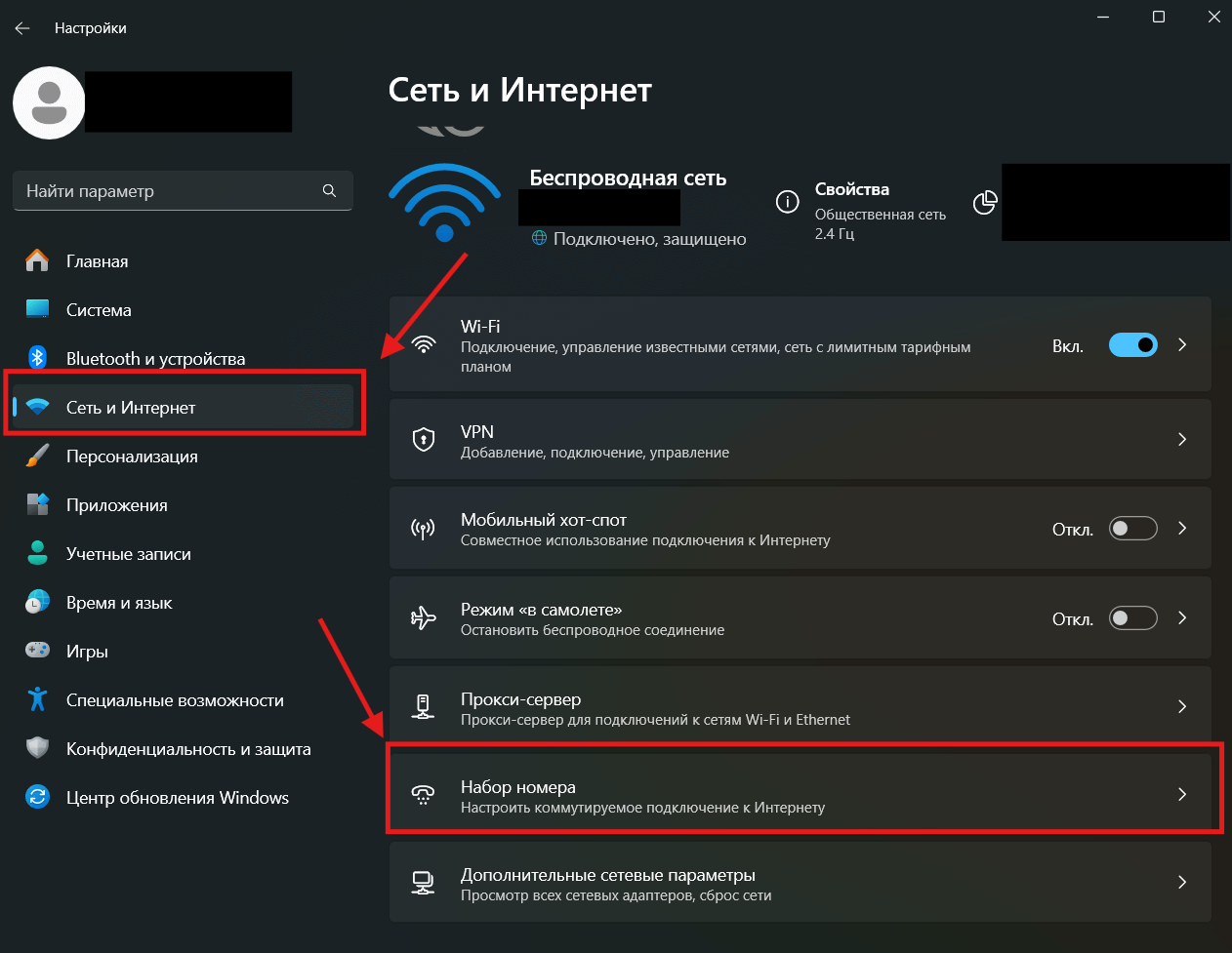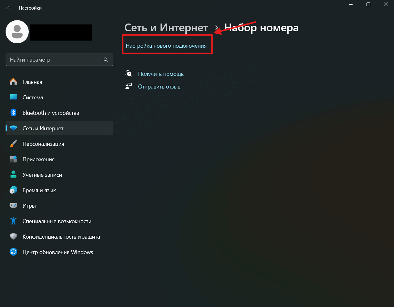 2. В открывшемся окне в левой стороне выбираем «Сеть и Интернет», и в открывшемся окне выбираем «Набор номера»
