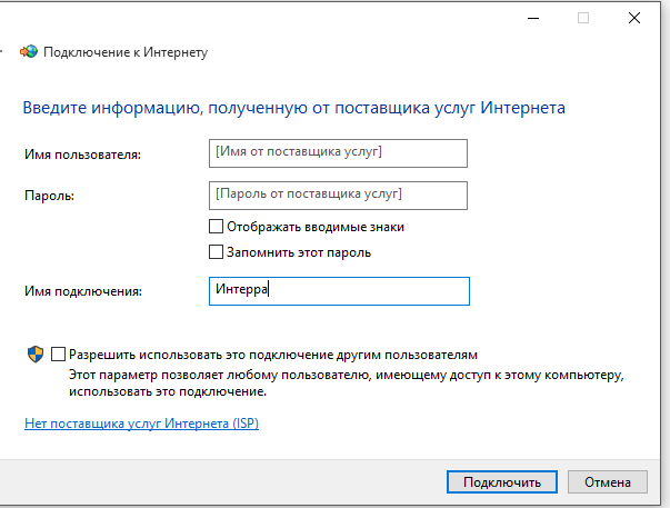 7. Вводим «Имя пользователя» и пароль в соответствующие поля, ставим галочку «Запомнить этот пароль», текст в строке «Имя подключения» можно изменить. Нажмите «Подключить».