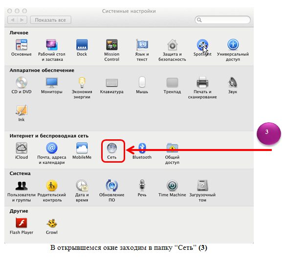 3. Вам откроется окно: «Системные настройки». В этом окне ищем пункт: «Сеть» и кликаем на него.