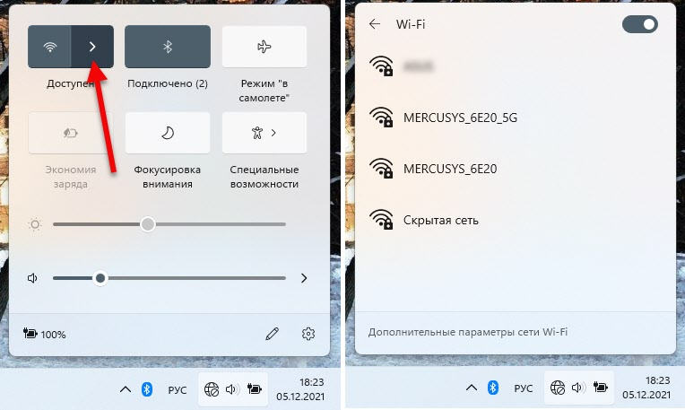 1. Нажмите на иконку подключения (в Windows 11 одновременно подсвечивается иконка подключения к интернету, звука и управления электропитанием) в трее (в правом нижнем углу). Там должна быть кнопка Wi-Fi. Если он выключен, то нужно сначала нажать на кнопку для включения Wi-Fi. Или перейти в настройки (рядом кнопка со стрелочкой) и уже там включить.