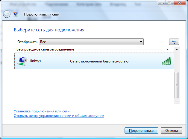 6. В открывшемся окне будут отображаться доступные беспроводные сети, которые находятся в зоне действия Вашего компьютера. Выберите вашу сеть — 1 и затем нажмите кнопку «Подключиться».