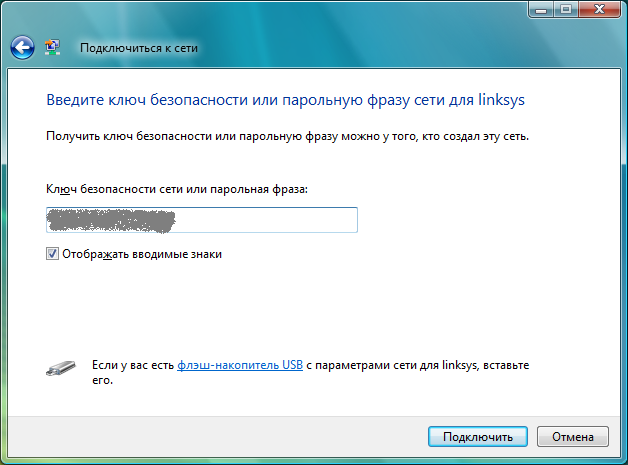 7. В следующем окне будет отображаться ход подключения к данной сети. Необходимо также ввести ключ безопасности Wi-Fi сети. В случае успешного подключения появится следующее окно