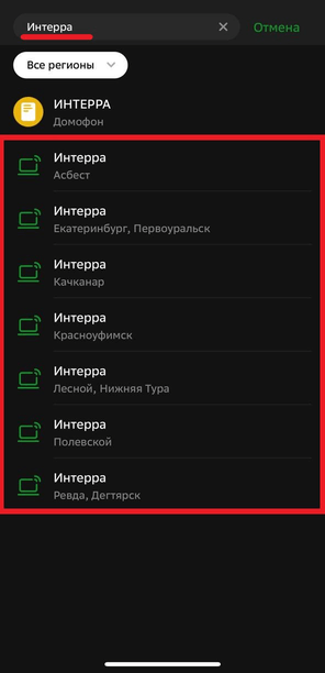 5. В поле поиска пишем слово «интерра». Нам выходит список. Выбираем ту строку где указан нужный нам город.