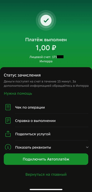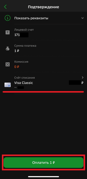7. Далее можно выбрать счёт списания. Проверить правильность введенного лицевого счёта и суммы оплаты.