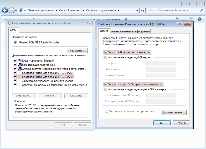 3. Теперь ищем в списке компонентов «Протокол интернета IPv4», в OC Windows XP он называется «Протокол интернета TCP/IP». Щелкаем 2 раза левой кнопкой мыши по нему (самому тексту) не снимая галочки напротив него. Открывается окно настроек данного протокола, там должно выставлено всё автоматически как на рисунке ниже.