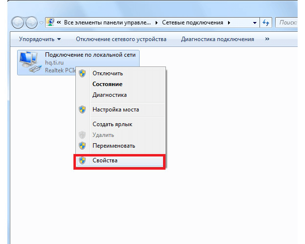6. На ярлыке «Подключение по локальной сети» нажмите правой кнопкой мыши. В открывшемся меню выберите «Свойства»